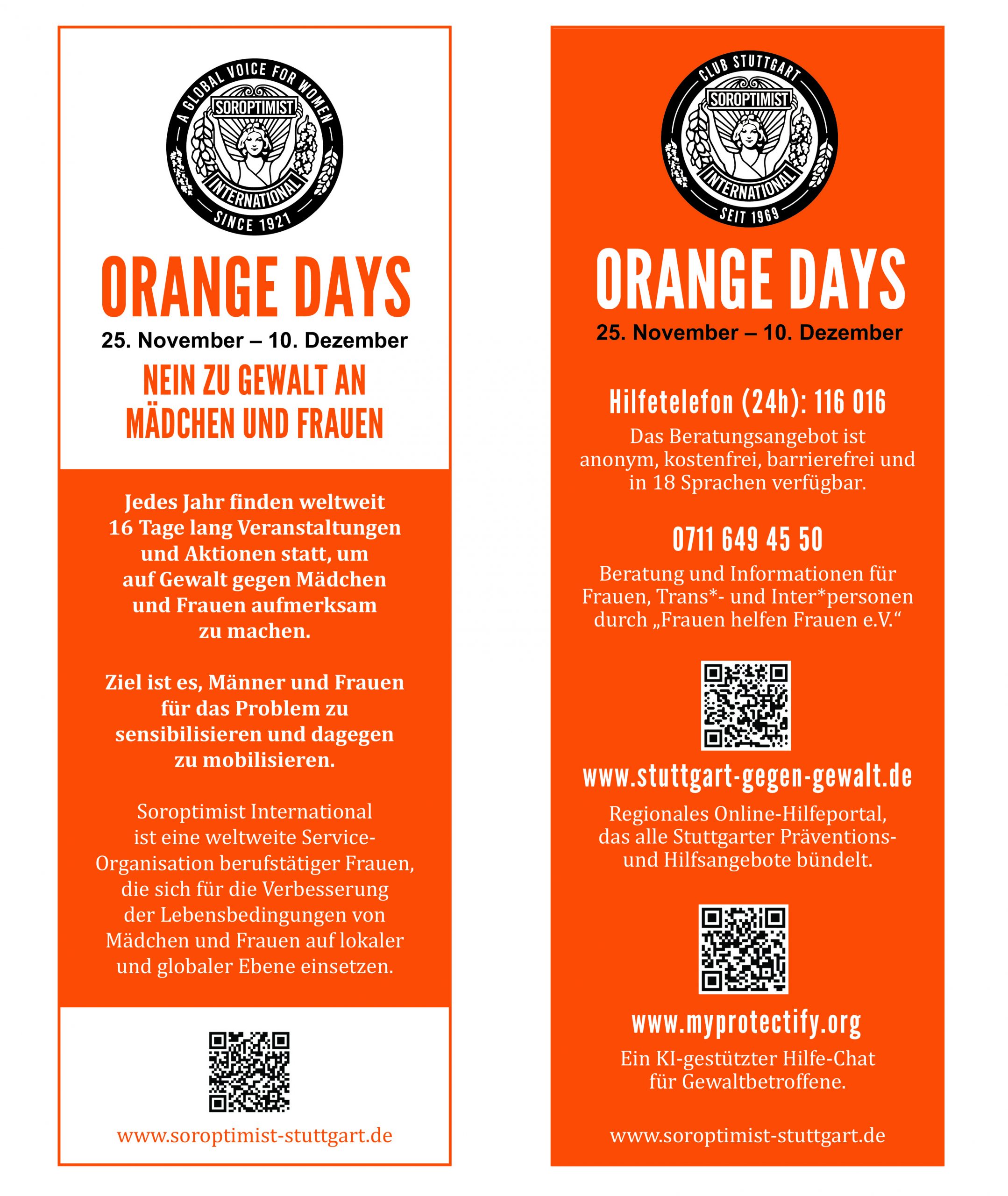 Am 25. November, dem Internationalen Tag zur Beseitigung von Gewalt, beginnt die weltweite Kampagne der ORANGE DAYS, um auf Gewalt gegen Frauen, Mädchen und andere gefährdete Personen aufmerksam zu machen. Am Tag der Menschenrechte, am 10. Dezember endet die Initiative.